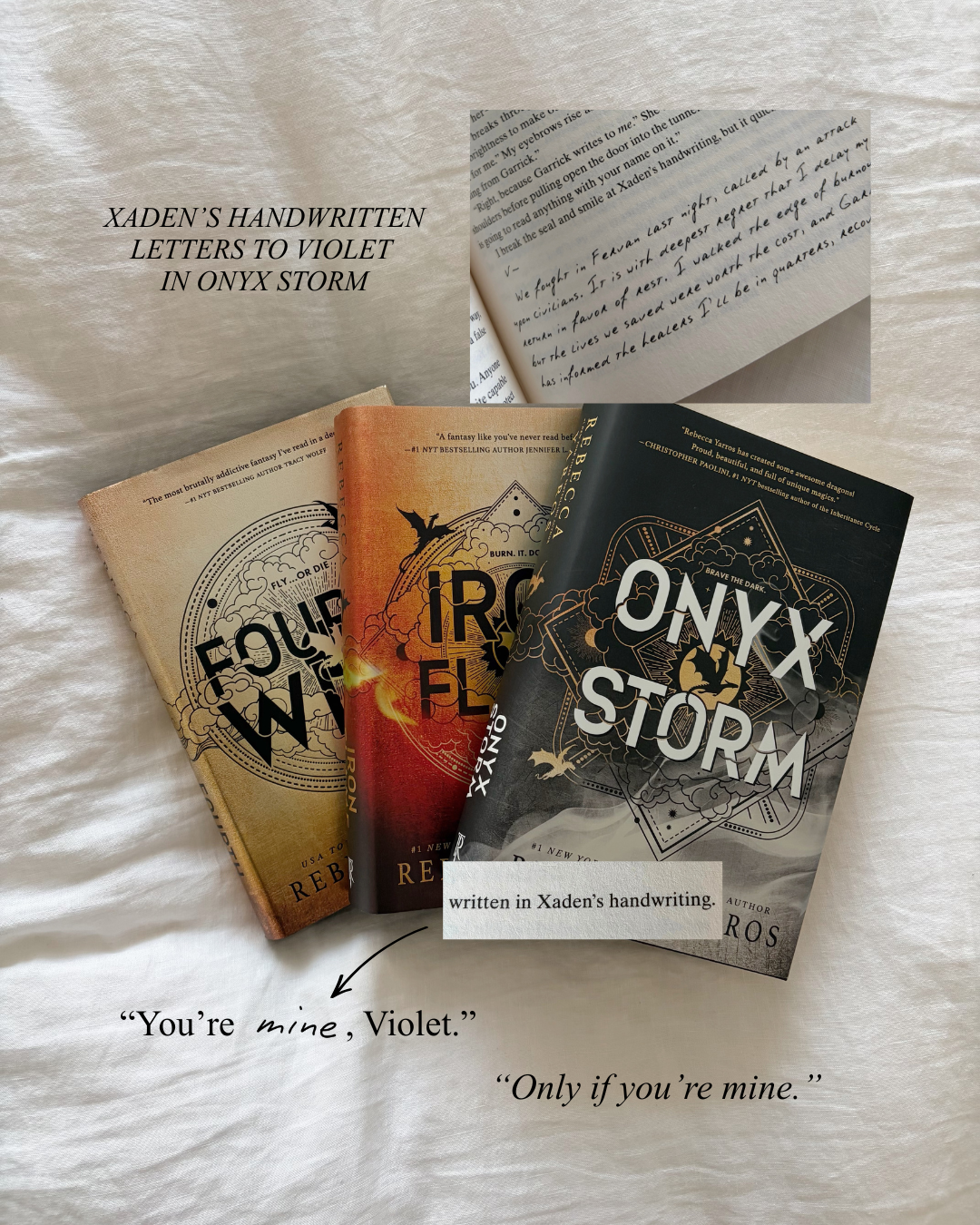 Special delivery from your favorite shadow wielder. Small enough to fit under your flight leathers, this mini heart necklace features engraved quotes from book 1 on both sides. One with the phrase "mine" written in Xaden's handwriting from the book, and the other Violet's response "only if you're mine".